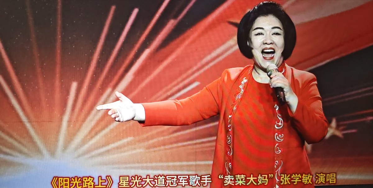 经典旋律传递奋进力量,星光大道冠军歌手“卖菜大妈”张学敏压轴登台,带来经典曲目《阳光路上》。她以质朴又充满力量的嗓音,将积极向上的人生态度与对美好生活的向往融入歌声,励志的旋律感染了现场每一位观众,将整场晚会的氛围推向最后的高潮,也为整场演出画上了浓墨重彩的一笔。