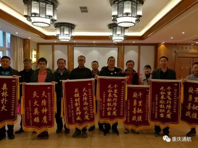 张士双机长(左四)代表重庆通航公司接受南方航空护林总站副总站长吴灵、雅江县县委常委、常委副县长江勇刚颁发的锦旗