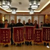 张士双机长(左四)代表重庆通航公司接受南方航空护林总站副总站长吴灵、雅江县县委常委、常委副县长江勇刚颁发的锦旗