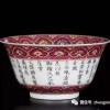 本碗小巧别致,敞口、斜腹、圈足。整器装饰清雅简洁,器内壁,外壁上下分以胭脂紫地之上,绘饰洋彩轧道如意卷花云头纹一周,彰显乾隆一朝之华丽洋彩特色。腹部中留白处绘写乾隆皇帝御题诗文:“梅花色不妖,佛手香且洁。松实味芬腴,三品殊清绝。烹以折脚铛,沃之承筐雪。火候辨鱼蟹,鼎烟迭生灭。越瓯泼仙乳,毡庐适禅悦。五蕴净大半,可悟不可说。馥馥兜罗递,活活云浆澈。咨询15712077800偓佺遗可餐,林逋赏时别。懒举赵州案,颇笑玉川谲。寒宵听行漏,古月看悬玦。软饱趁几余,敲吟兴无竭”,后落“乾隆丙寅小春御题”(丙寅为1746年)年款,另有篆书“干”、“隆”圆、方二朱文钤印各一枚。碗心则以松树、梅花、佛手饰之,与诗文相应。底署矾红“大清乾隆年制”六字篆书款。