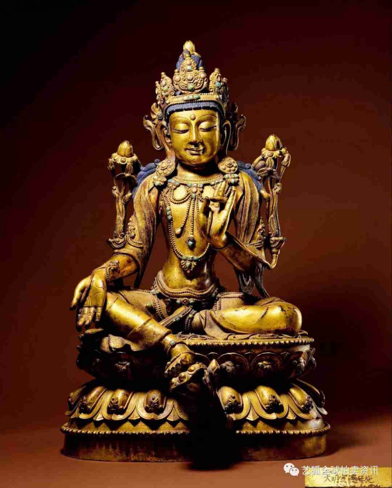 明宣德 御製鎏金铜四臂文殊菩萨坐像 「大明宣德年施」楷书刻款