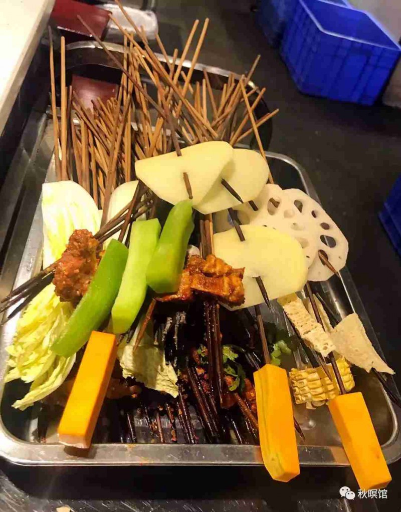 盆子里一面是鸡串,另一面是各类蔬菜串串。