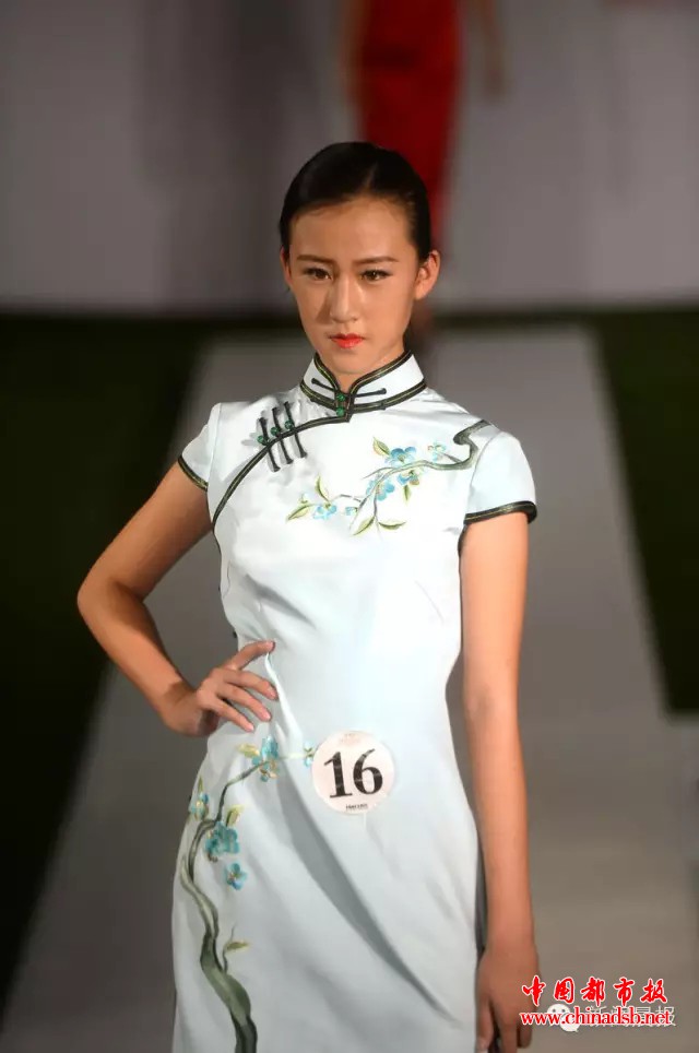 母亲说,女儿从10岁开始身高猛长,目前上初一。这是她第一次穿高跟鞋和旗袍,第一次参加选美比赛,家人都非常佩服孩子的勇气。